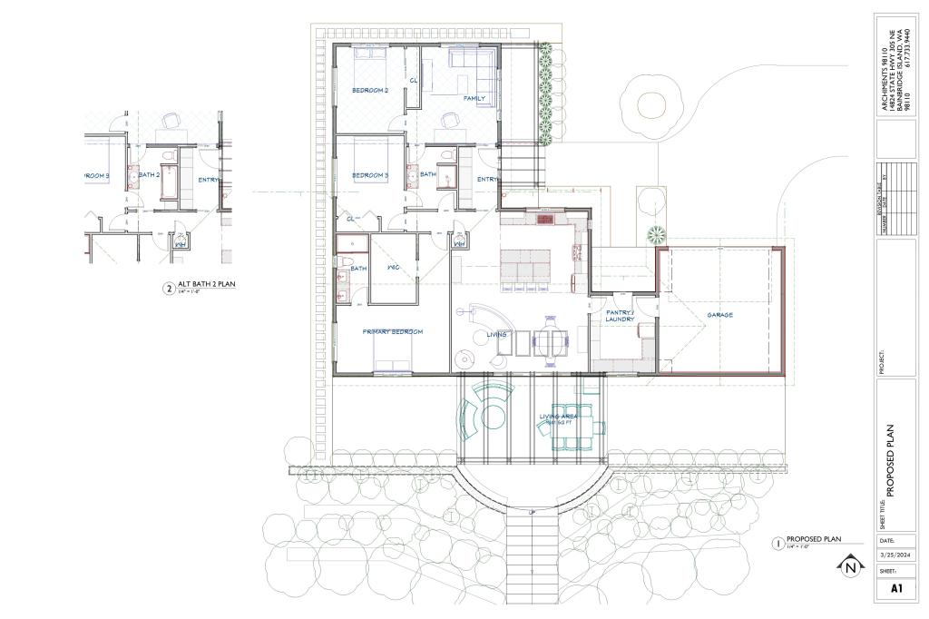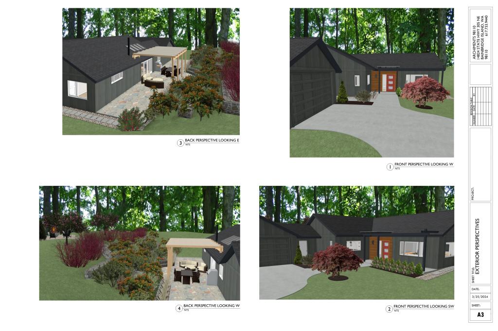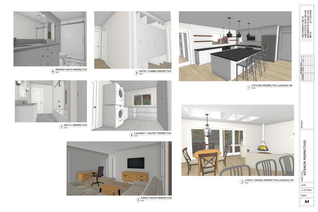The house is dated, in need of repairs and the spaces no longer work for the family of four. They would like more natural light inside and a stronger inside / outside connection and the ability to use their backyard more comfortably. The current T-shaped galley kitchen is cramped and inhibits workflow. Comfortable seating is at a premium and the bathrooms are crowded. What storage they currently have is overflowing. The proposal is for a 400 sf addition that would house a family room and one of the bedrooms. This will take some of the pressure off the current space and allow for more storage and bigger bathrooms. The kitchen will flip to the front of the house which will provide a larger L-shaped work area wrapped around an island sized to accommodate four. The dining will move to the back which will allow a 12′ slider to be installed along the back wall which will provide more light and connection to the backyard. An covered pergola type structure stairs and terracing will make the backyard more accessible. The current front porch will be enclosed and become the entry providing a visibly more welcoming entrance as well as a mudroom.