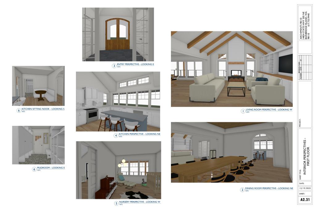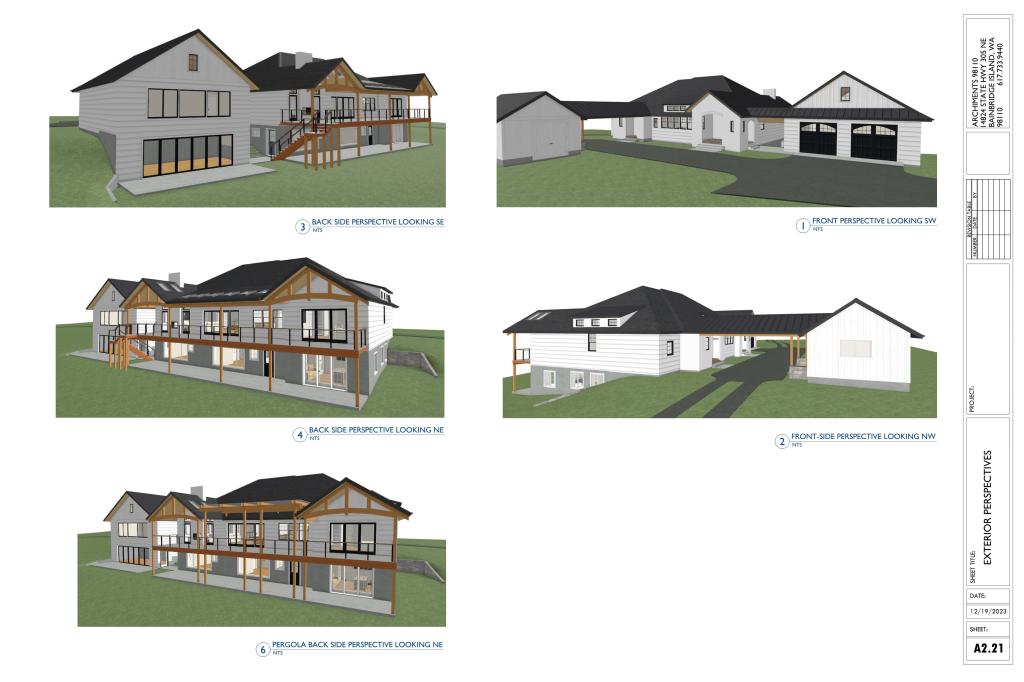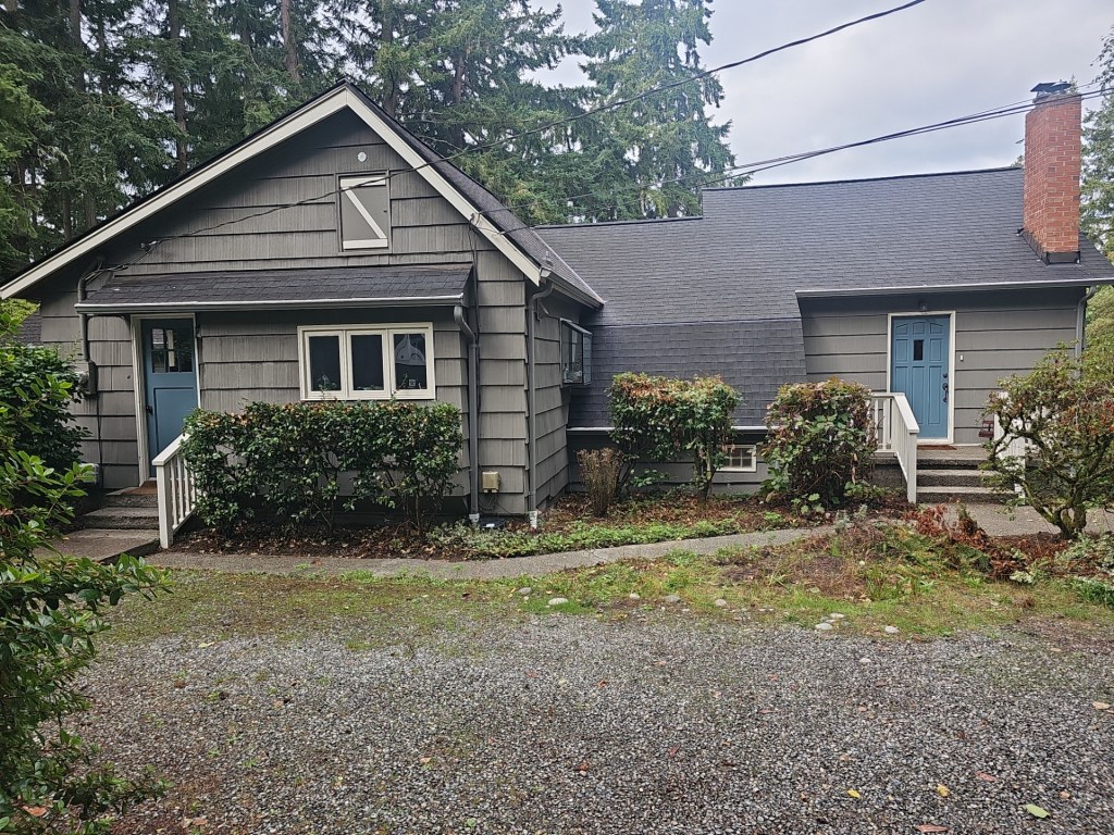 This is a two story house, entered on the upper floor with a lower level that houses a little mother’s-in-law apartment. The back of the house has a beautiful view to Agate Passage and the mountains beyond. The original part of the house was built in the 30’s and it’s been added onto several times. Circulation and room flow is awkward. It is also in need of repair and updating. This is a very ambitious project with several new additions and new rooflines as well as a separate two car garage housing a gym and an artist studio.