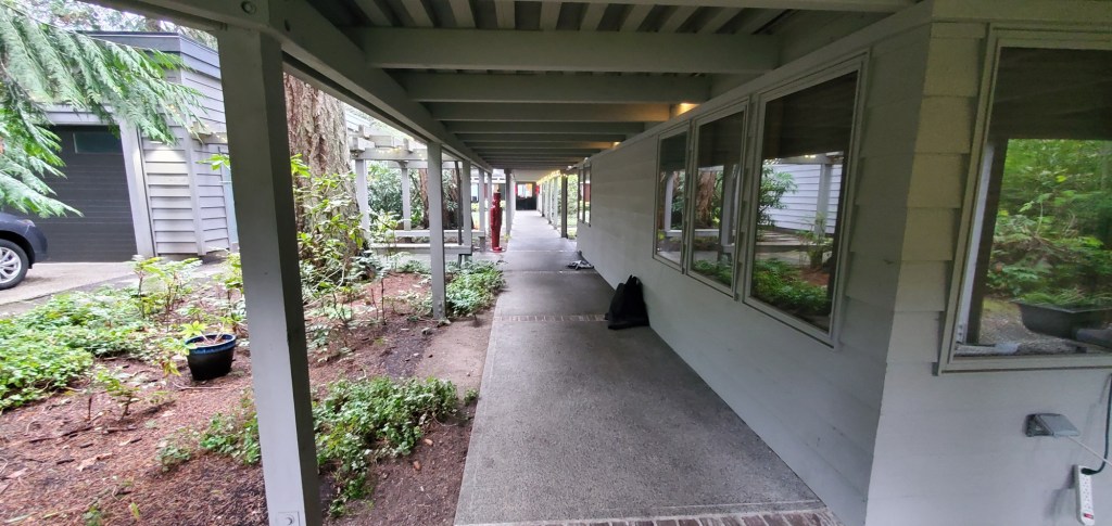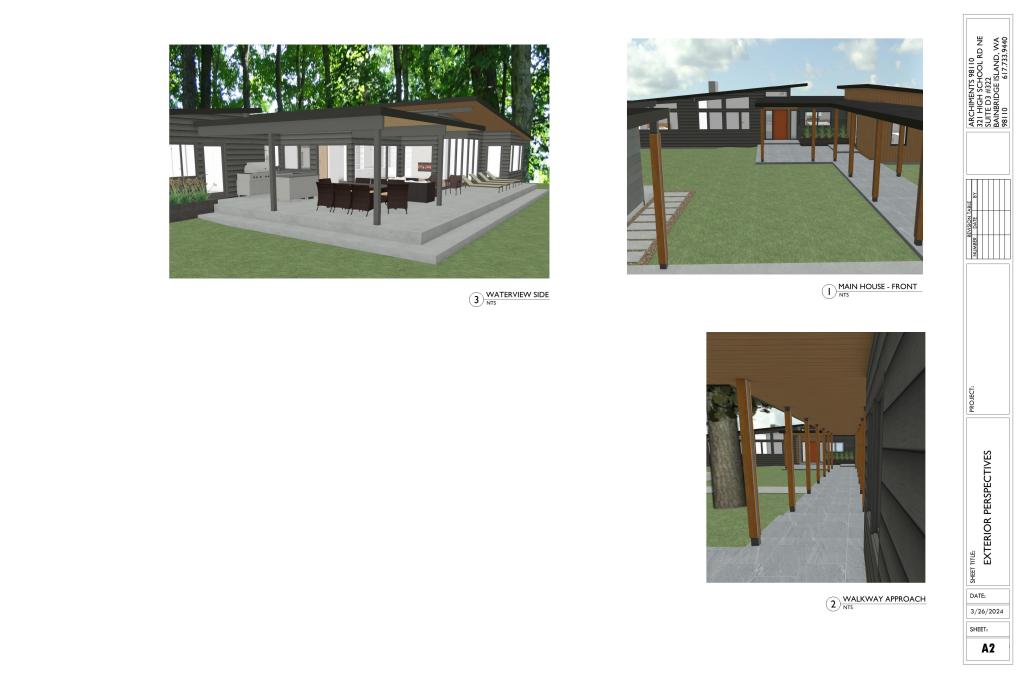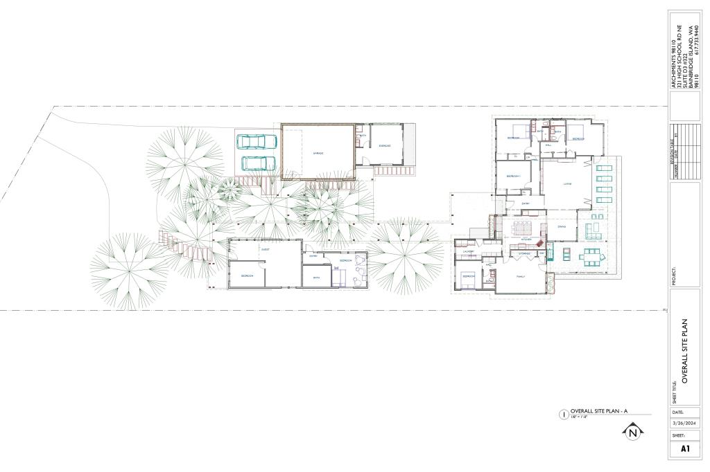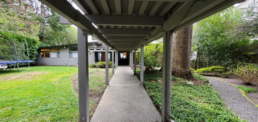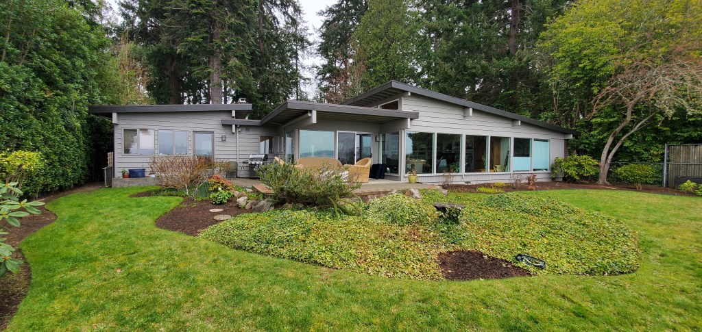 This mid-century modern compound looks out across an expansive lawn to Puget Sound and Seattle. The main house, guest house and garage are tucked in amongst giant fir trees and are connected by an covered walkway. The program includes more bedrooms and bathrooms for this family of six, a larger better functioning kitchen, maximizing the guest house area and adding a workout room to the garage as well as redesigning the rotting walkway.